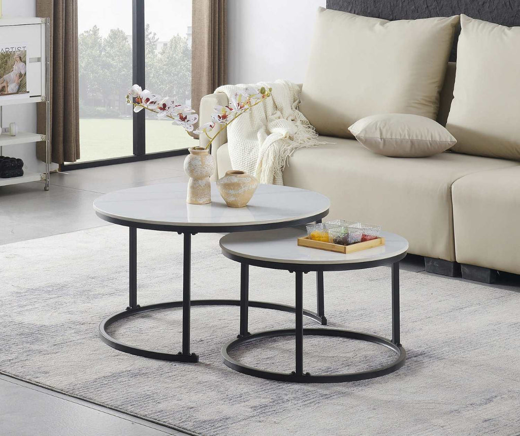 Elevate your living space with this exquisite set of two coffee tables featuring pristine snowy white sintered stone marble tops. The sophisticated contrast of the luxurious marble against the sleek black steel base creates a timeless aesthetic that complements both contemporary and classic interiors. Meticulously crafted for both elegance and durability.