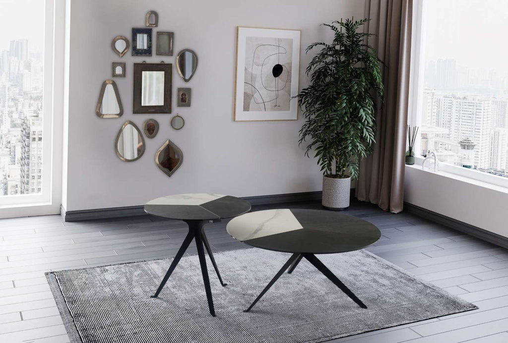 Rejuvenate your living room with the multifaceted finishes of the Titan collection. This contemporary design features a modern silhouette with a minimalist black metal tripod base rising to support a sturdy round tabletop. Italian ceramic over tempered glass mimics the look, feel, and elegance of stone construction to perfection, all while being easier to clean and maintain. Three different finishes in white marble, grey slate, and black stone give you total versatility with placement as these neutral hues are the perfect accent to your existing décor. To really make a statement, overlap the coffee table under the end table to create the effect of one larger layered table, and don’t be surprised if your set receives more compliments than your knick-knacks or coffee table books!