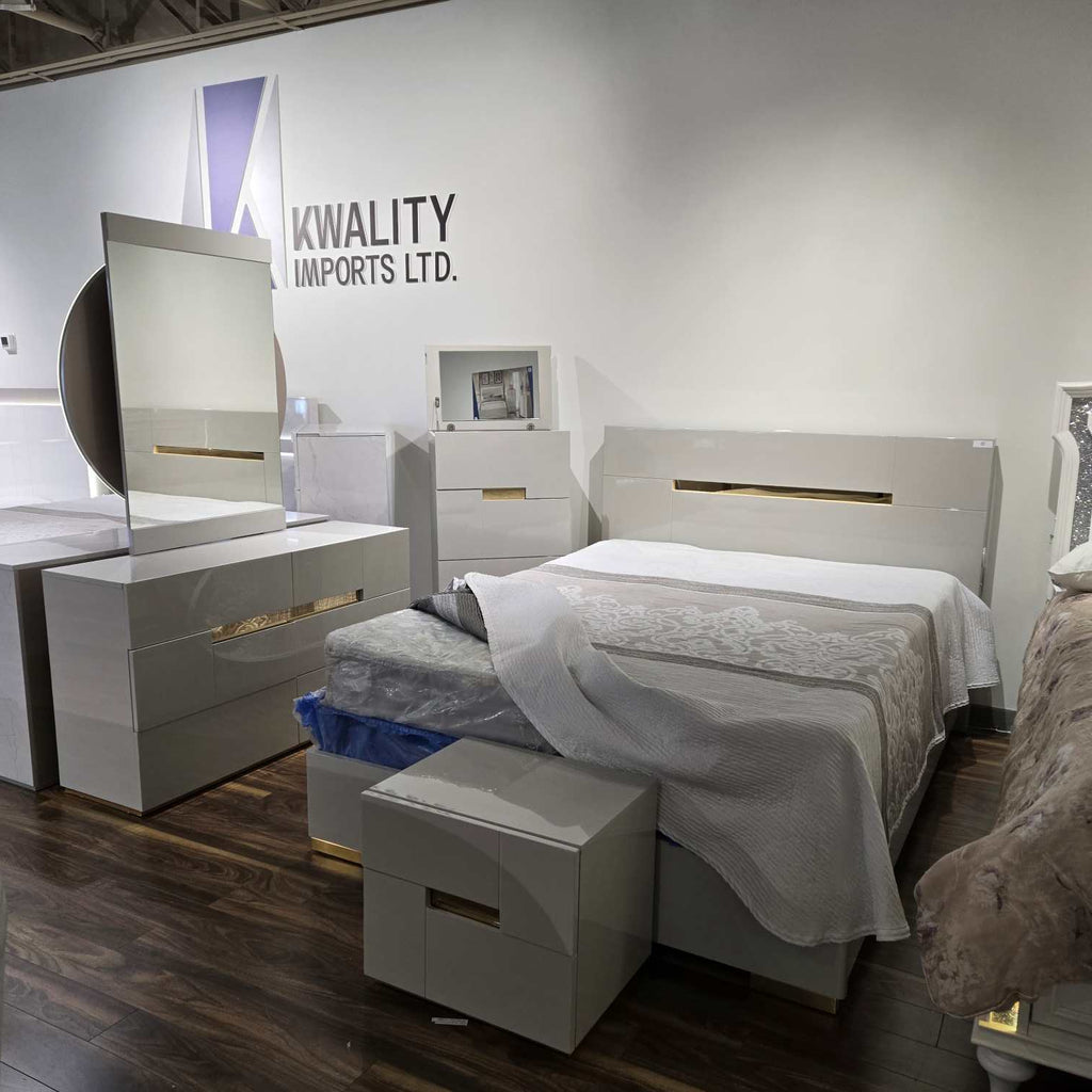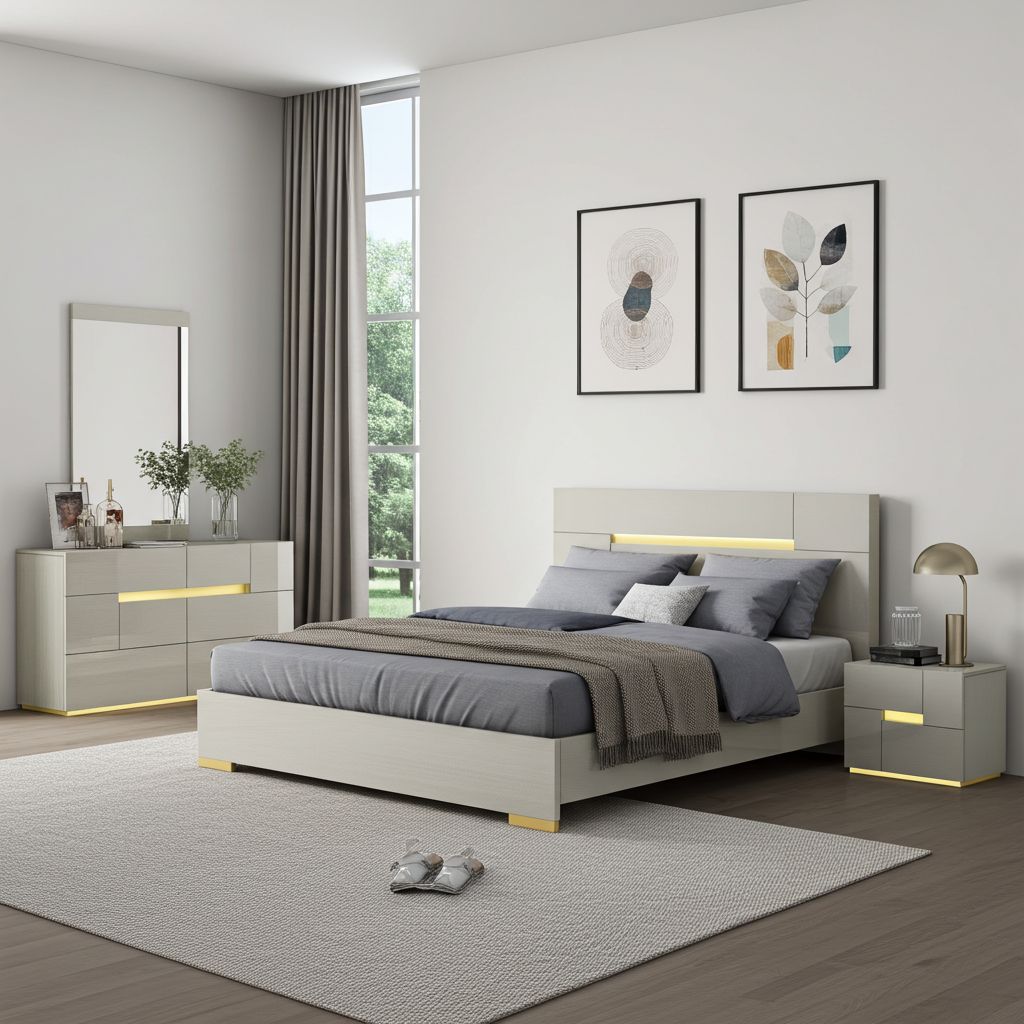 Experience modern elegance with the Triton Grey Bedroom Set SB172, designed to enhance your bedroom with subtle LED lighting, integrated Bluetooth speakers, and wireless charging for seamless convenience. This collection includes a queen bed, a nightstand with smooth full-extension slides, a large dresser and mirror combination, plus a spacious 4-drawer chest featuring full-extension slides and a hidden jewelry box, all crafted for refined functionality and sleek style.
