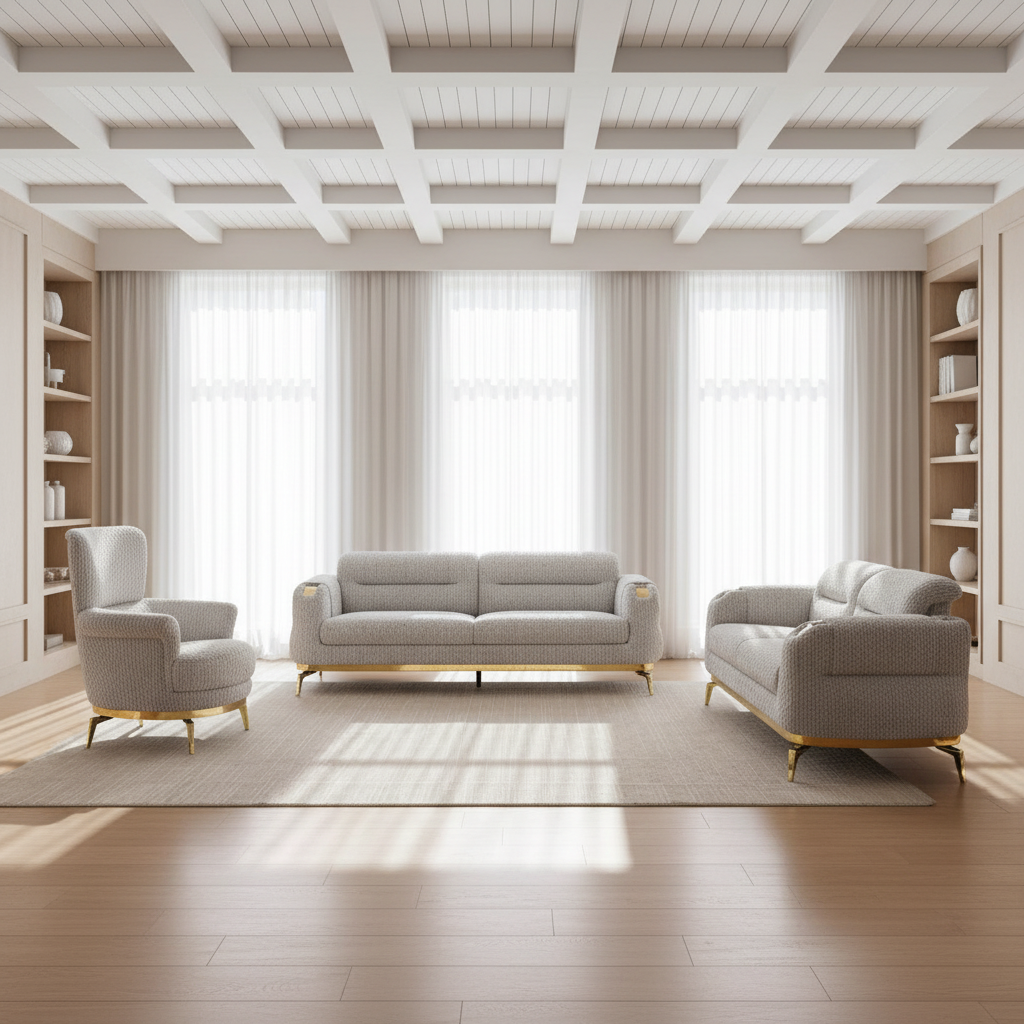Transform your living space with this elegantly crafted sofa set, designed for those who seek both style and substance. Wrapped in a luxurious grey fabric with a unique textured pattern, this set combines modern elegance with timeless comfort. The striking golden legs provide a chic touch, adding sophistication that catches the eye without overpowering your decor. Sink into the plush three-seater, loveseat, or armchair and experience comfort like never before. Elevate your home with furniture that feels as good as it looks.